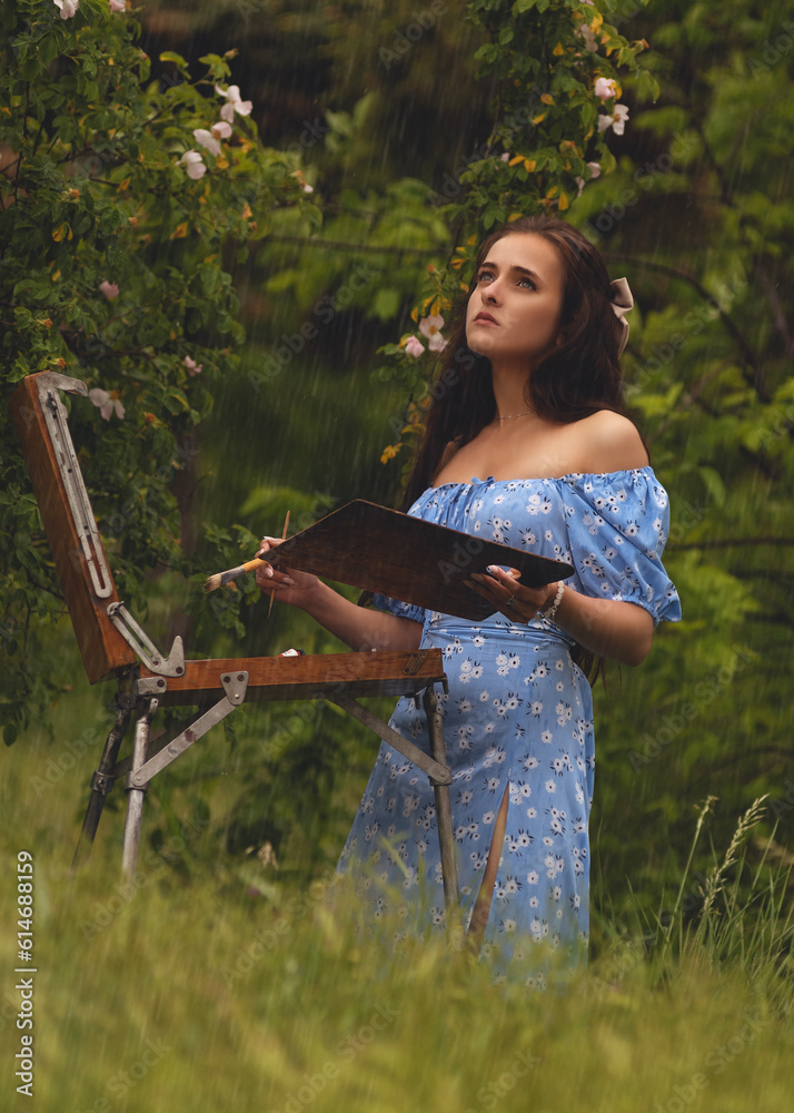 Beautiful young woman is relaxing while painting an art canvas outdoors in the park at rain.