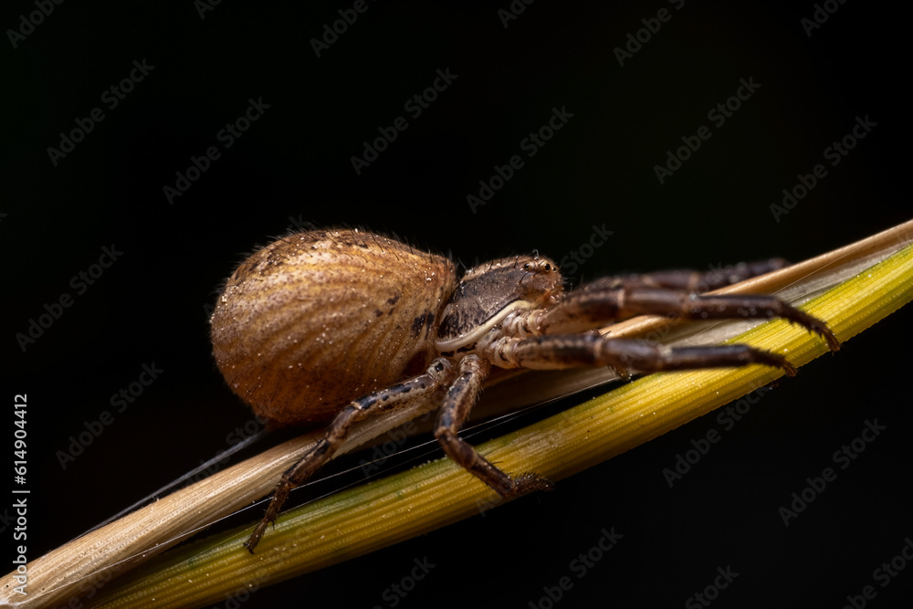 Crab Spider Xysticus ulmi, Close-up of a female crab spider (Xysticus ulmi) in a threatening position. The venomous spider is not dangerous to humans, a hunter spider.