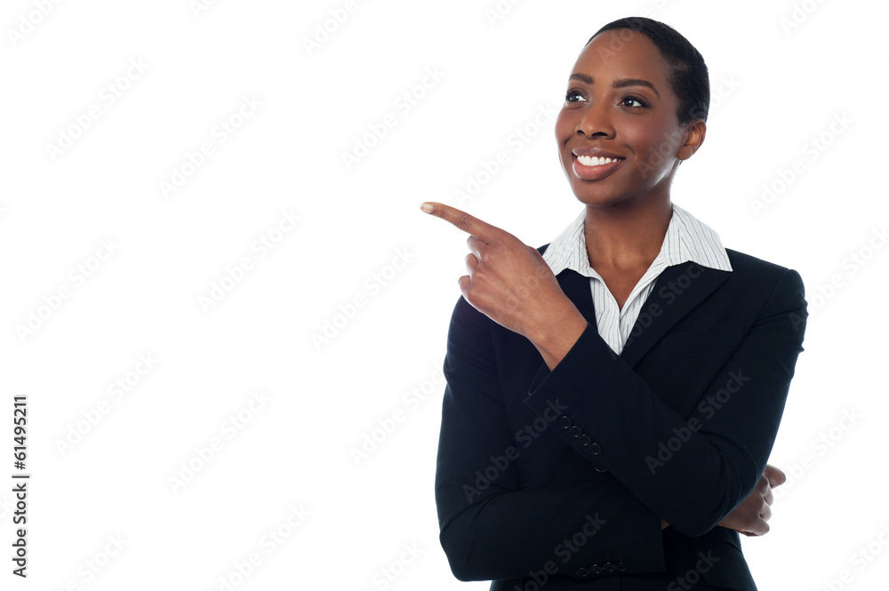 Experienced female executive pointing away