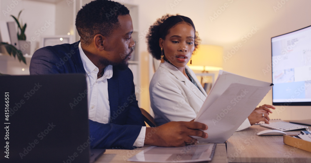 Business, black man and woman with documents, night and discussion for project, planning and feedback. African American female employee, coworkers and staff with review, paperwork and data analysis