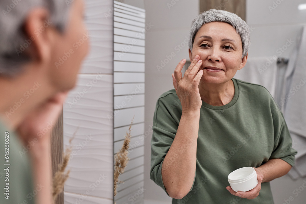Portrait of smiling senior Asian woman looking in mirror and using face cream