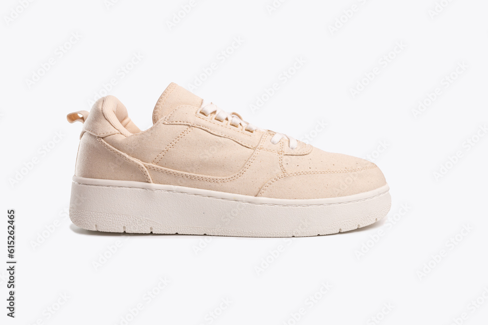 Classic hipster biege sneakers on white background, active lifestyle. Summer concept.