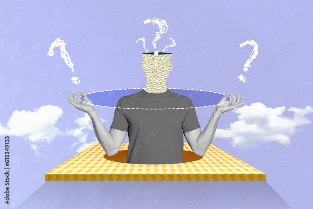 Collage image of black white colors guy book text page head question mark meditate clouds sky isolated on violet color background