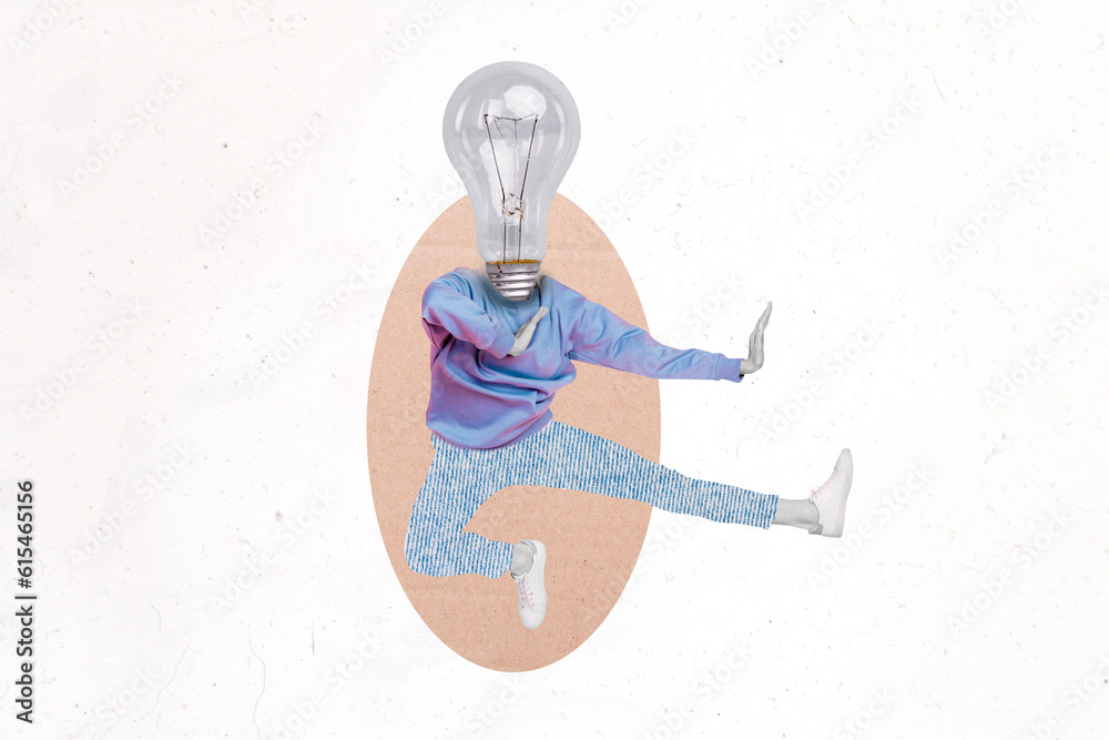 Collage portrait of jumping person leg kick fight huge light bulb instead head isolated on drawing white background