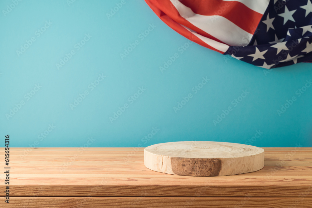 Empty wooden podium log on table over USA flag background. American national holiday mock up for design and product display