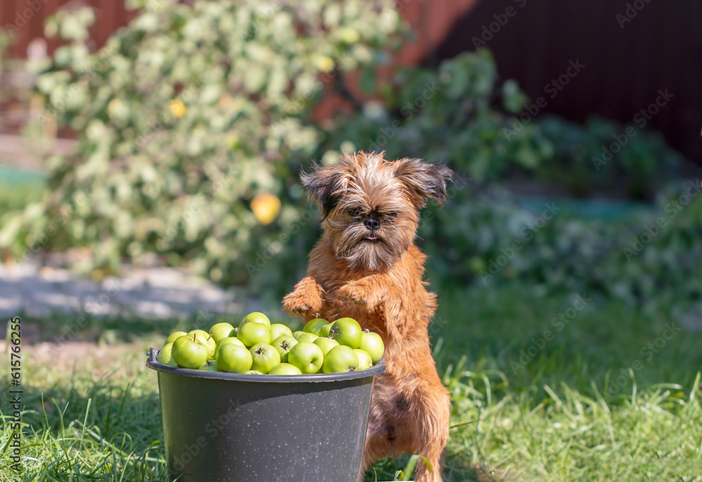 A small, shaggy red-haired dog stands near a bucket of apples on a garden plot
