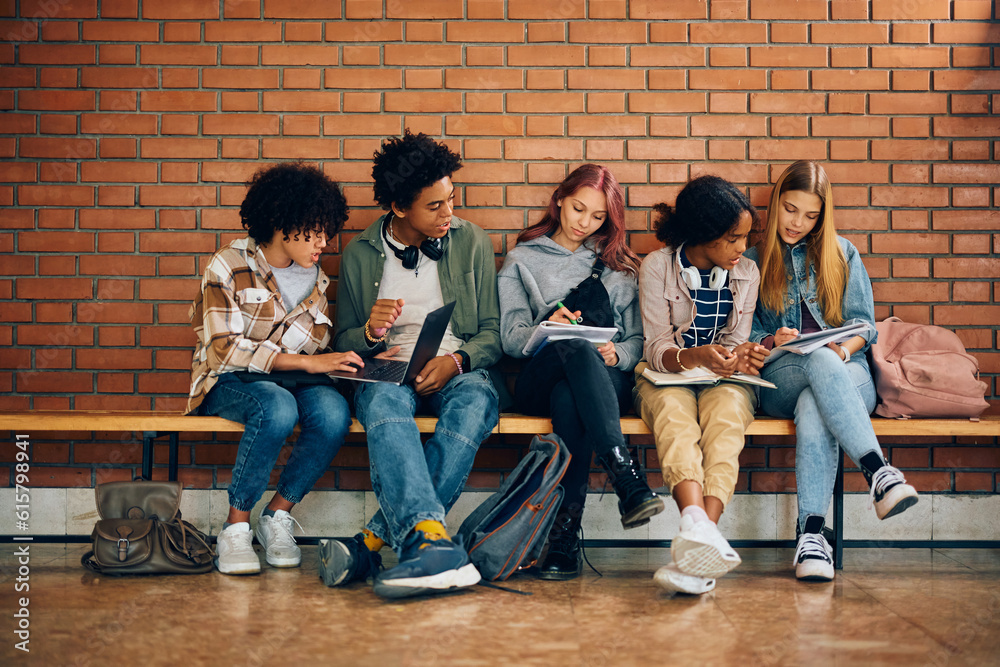 Multiracial group of teenagers studying together in high school hallway.