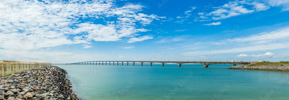 Panoramic view of the Ile de Ré bridge seen from La Rochelle shore on a sunny day in Charente-Maritime, France