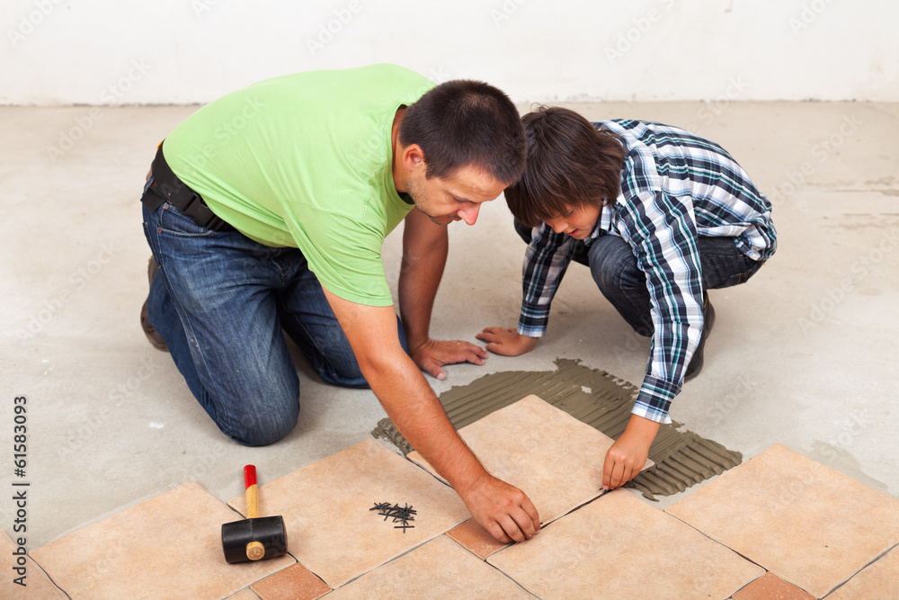 Man laying ceramic floor tiles helped by his son