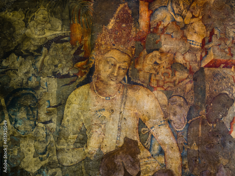 The 5th-century Bodhisattva Padmapani painting depicting the Buddha holding a lotus flower at Ajanta caves, Maharashtra, India.