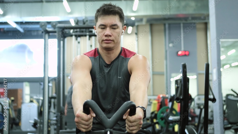 A man does exercises on the simulators in the gym. Exercise Press hands, sitting in the simulator.
