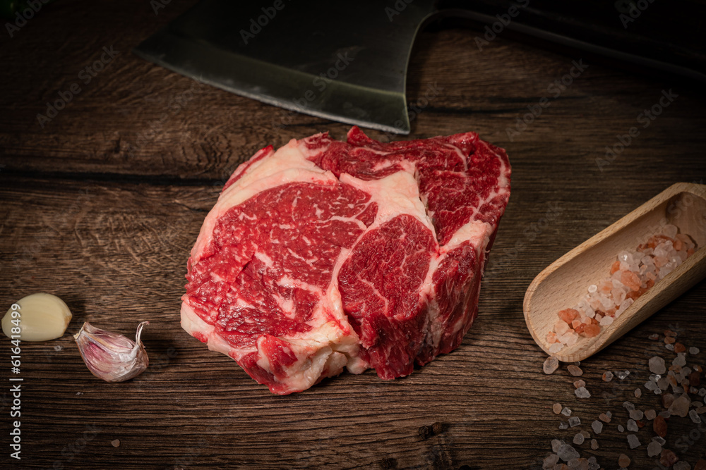 Organic machete or hanger butcher steak, near butcher knife with pink pepper and rosemary. Black background. Top view. side view
