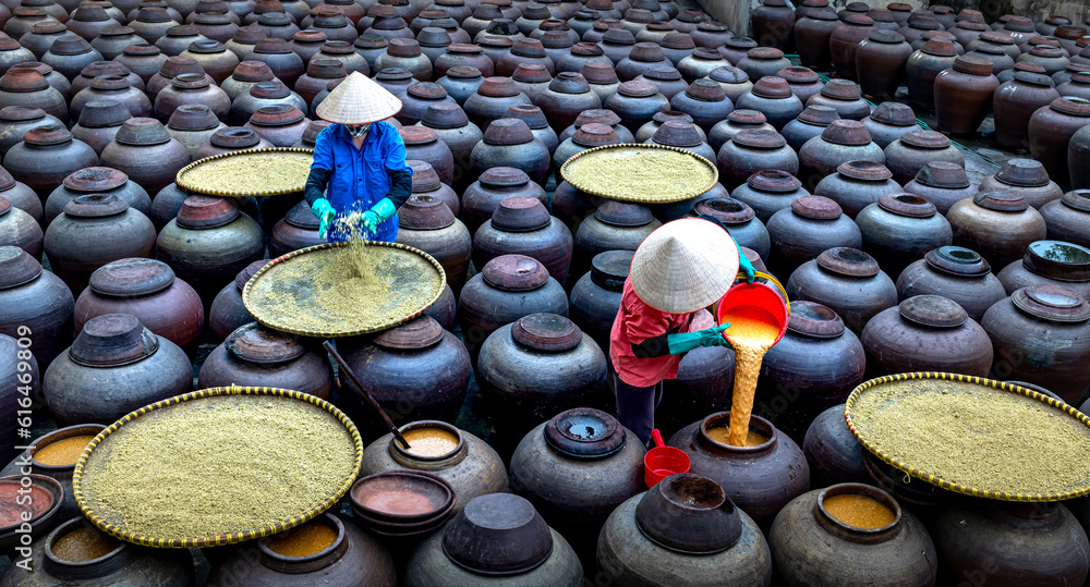 Traditional soy sauce factory, where soya beans are fermented to produce the soy sauce which is used in Vietnam cooking at a soy sauce factory in Hung Yen,VN