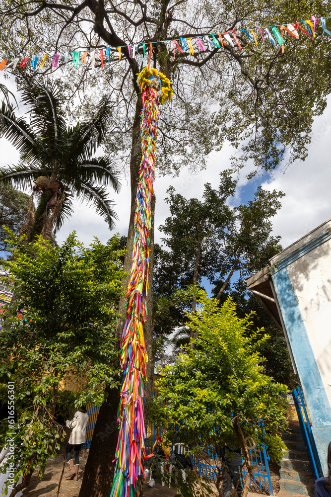 closeup of multicolored ribbons tied to a pole symbolizing the desires and requests of the devotees of Nossa Senhora dos Pretos in the Penha neighborhood, São Paulo, Brazil