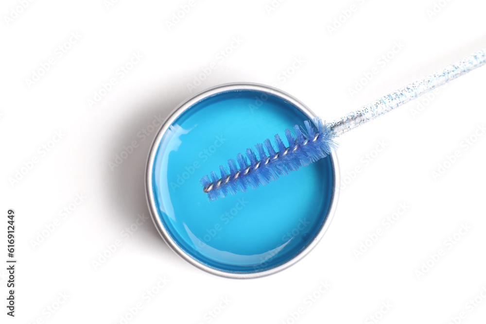 Wax for fixing, styling eyebrows in iron jar with brush isolated on white