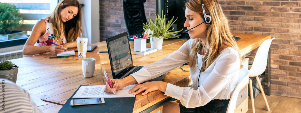 Young blonde woman with headset in customer help service of coworking. Assistance and support help concept.