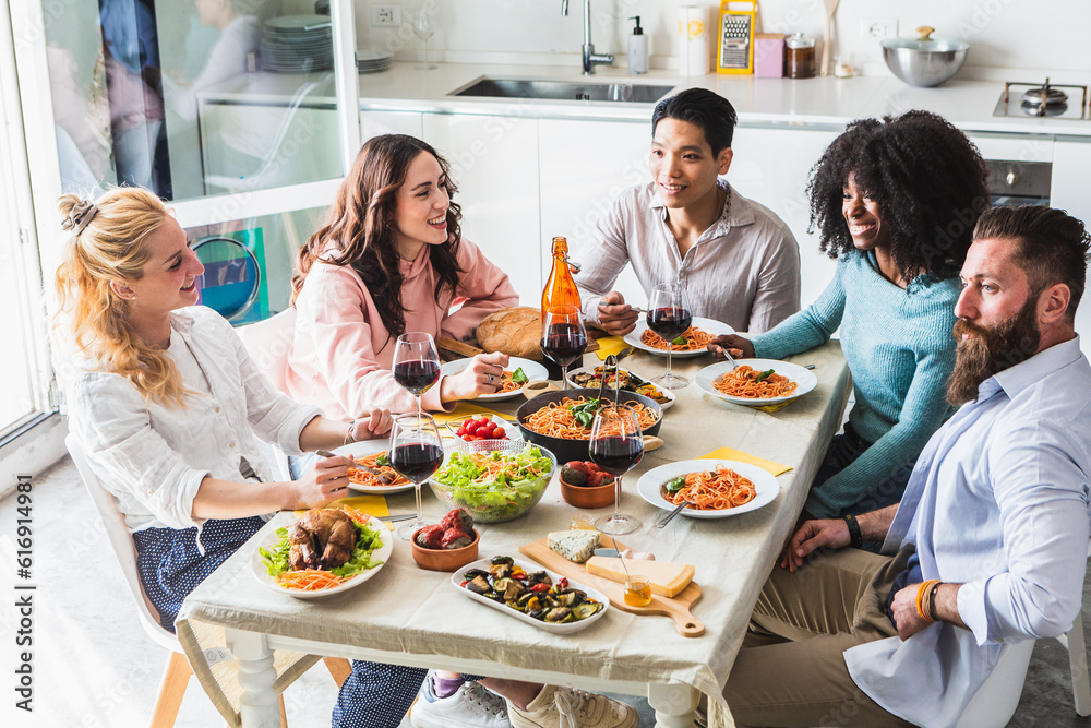 Group of multiethnic friends sitting at the table during lunch