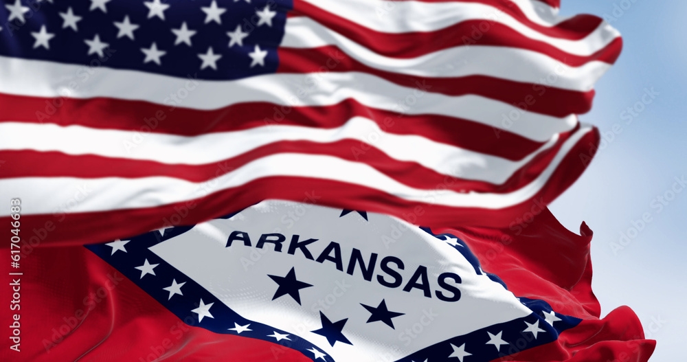 Arkansas state flags and US national flag waving in the wind on a clear day