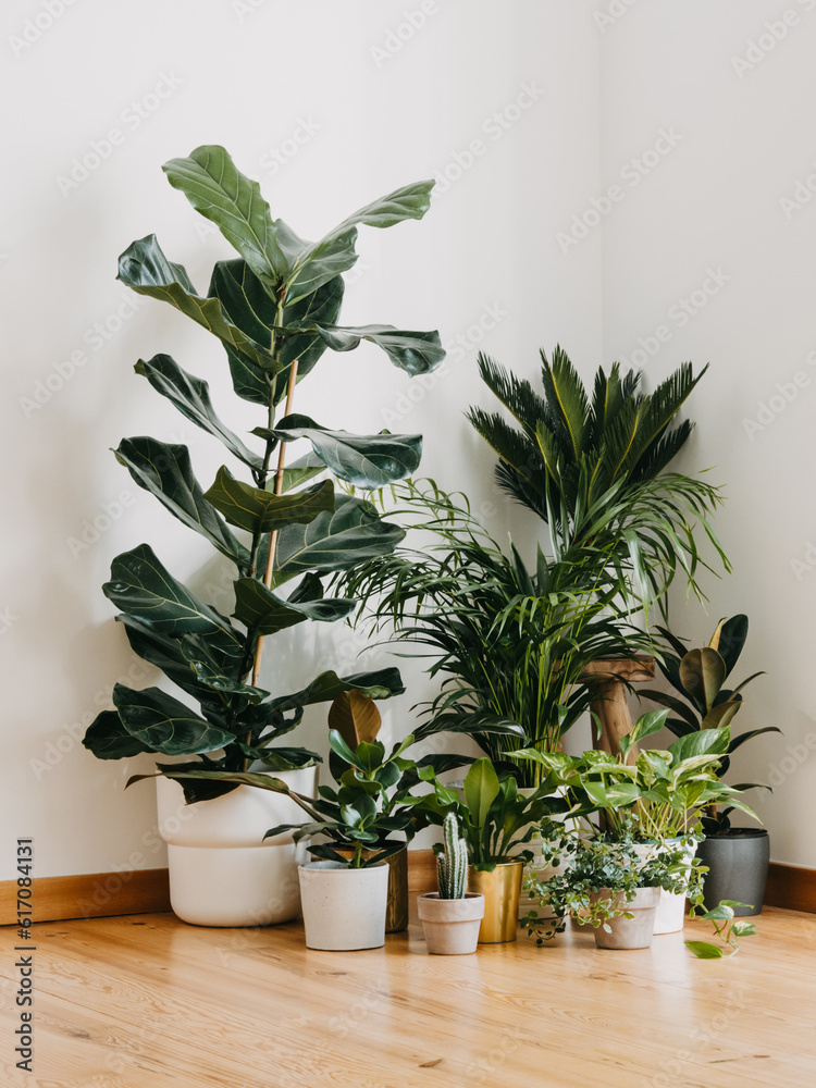 Interior with plants in living room on the floor. Composition of home garden plants industrial green interior.