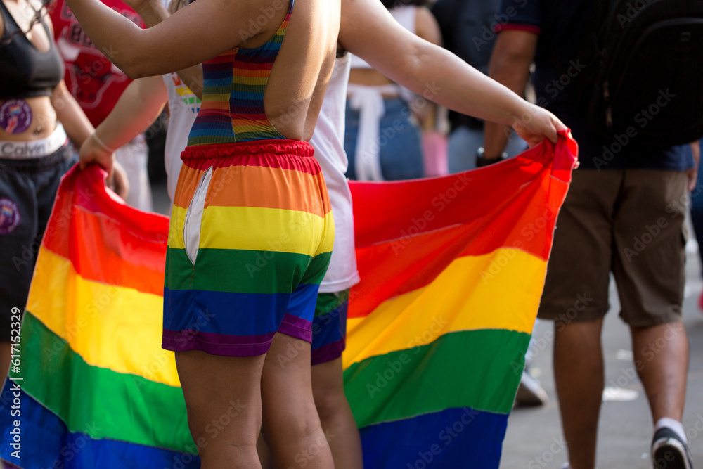 Jovens vestidos com com roupas com as cores da bandeira que simboliza o orgulho gay. 27ª edição, da Parada do Orgulho LGBT+ de São Paulo, Brasil.