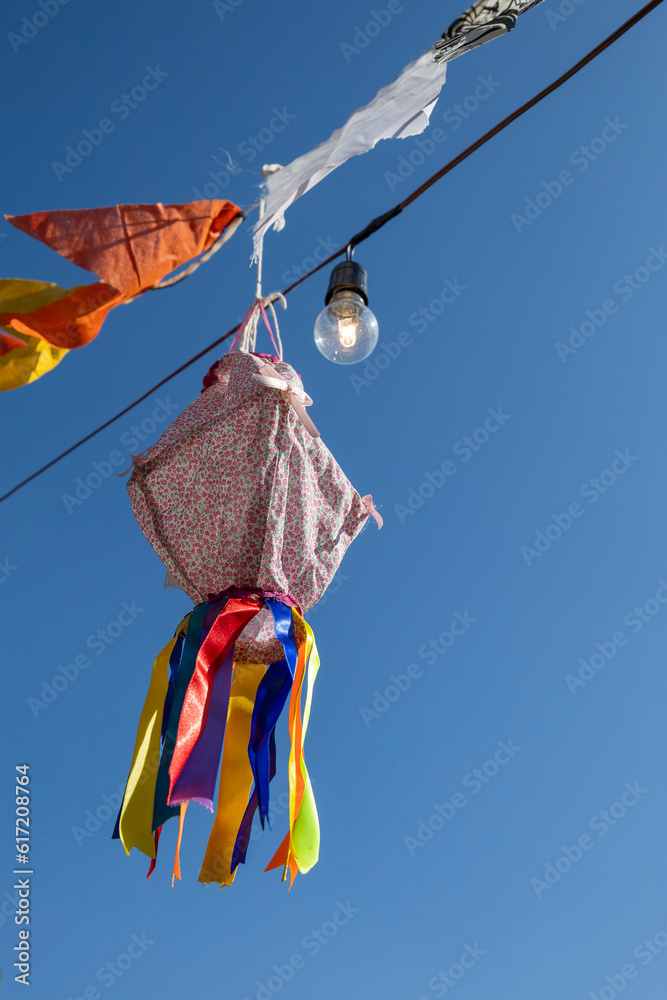 Balloons and hanging flags form a multicolored scene and decorate traditional brazilian June festival.