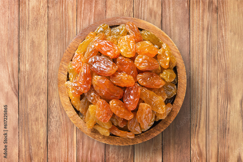 large, light raisins in bowl on wooden table background, top view. organic vegetarian food.