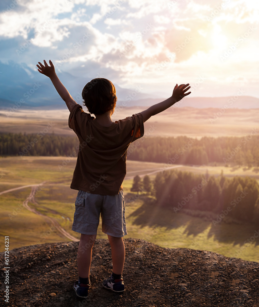 A little boy stands on top of a mountain with his hands up and looks at the sunset