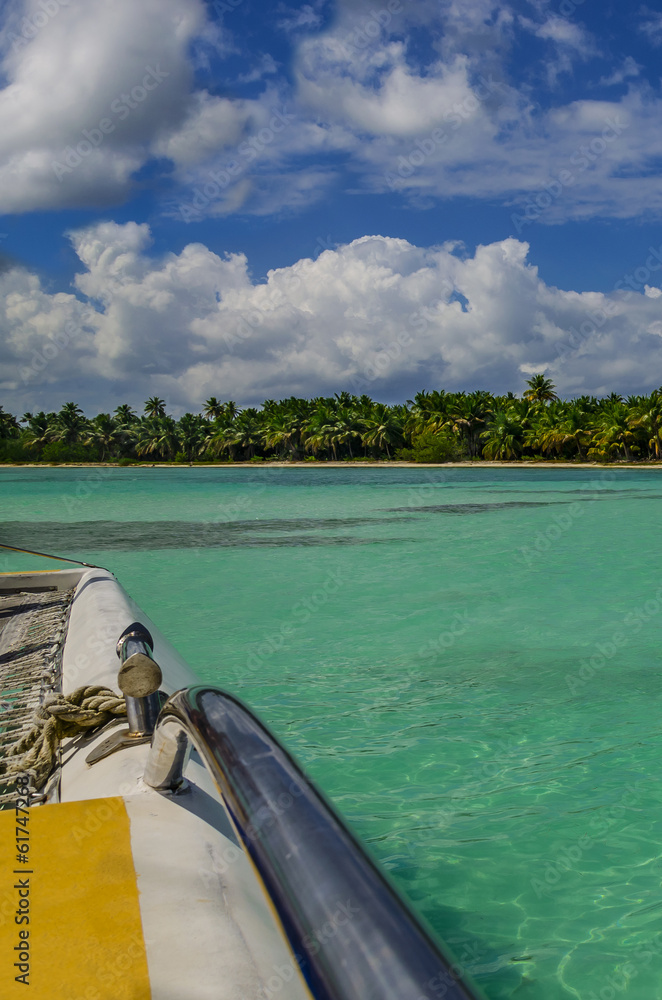 Catamaran sails on Caribbean Sea among azure water