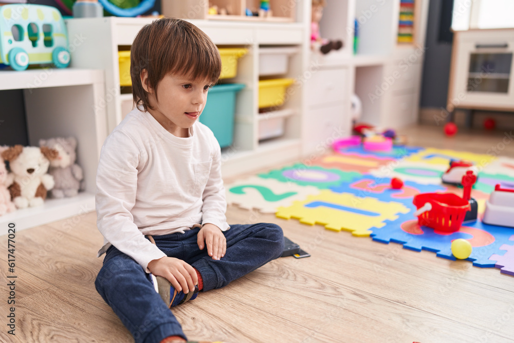 Adorable caucasian boy sitting on floor with relaxed expression at kindergarten