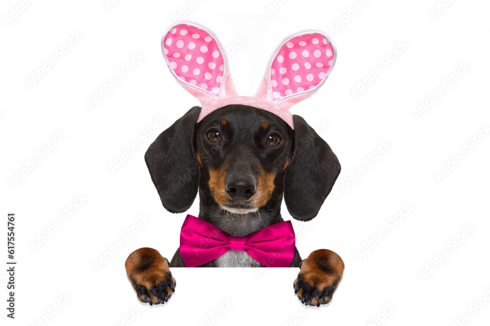 dachshund sausage dog with bunny easter ears and a pink tie, holding a blank banner,placard or blackboard, isolated on white background