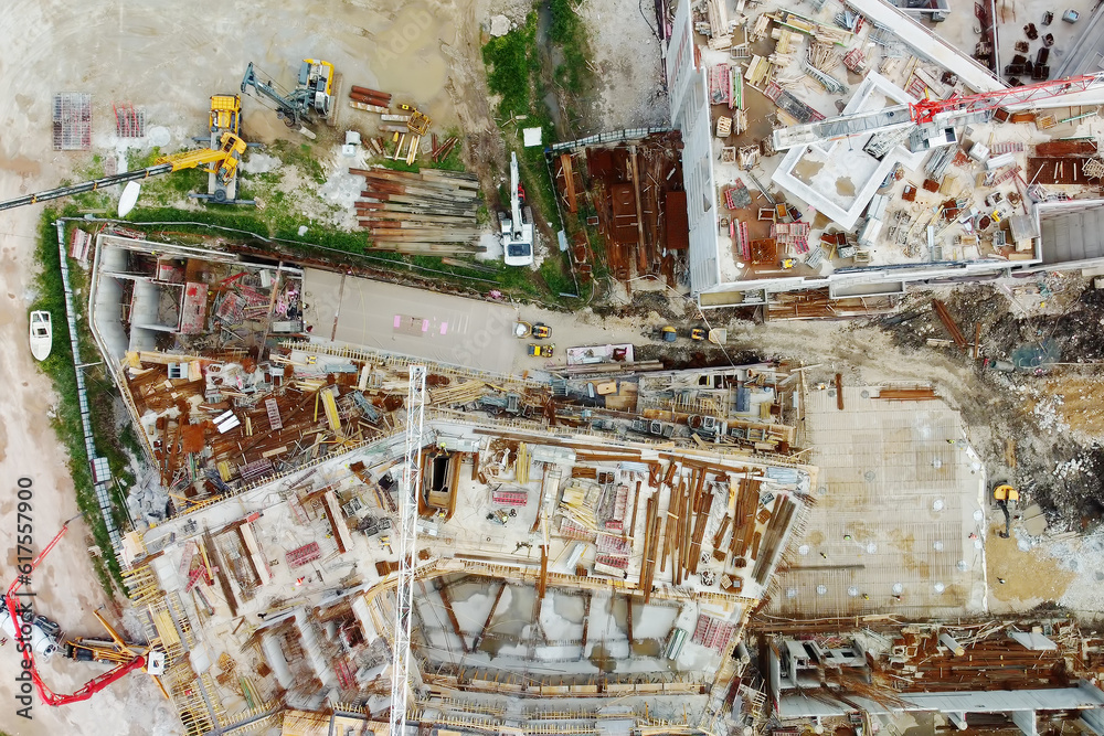 Aerial drone view of construction site of new modern building. Housing for a mortgage. Loan to construction of real estate.