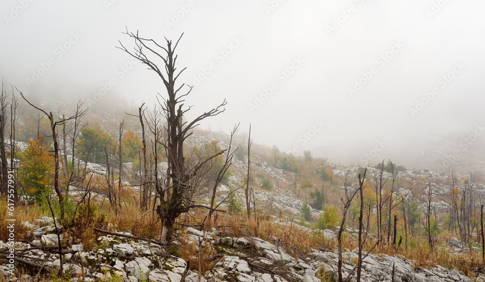 A picturesque landscape of a mountain valley in Lovchen National Park, Montenegro on an autumn foggy day