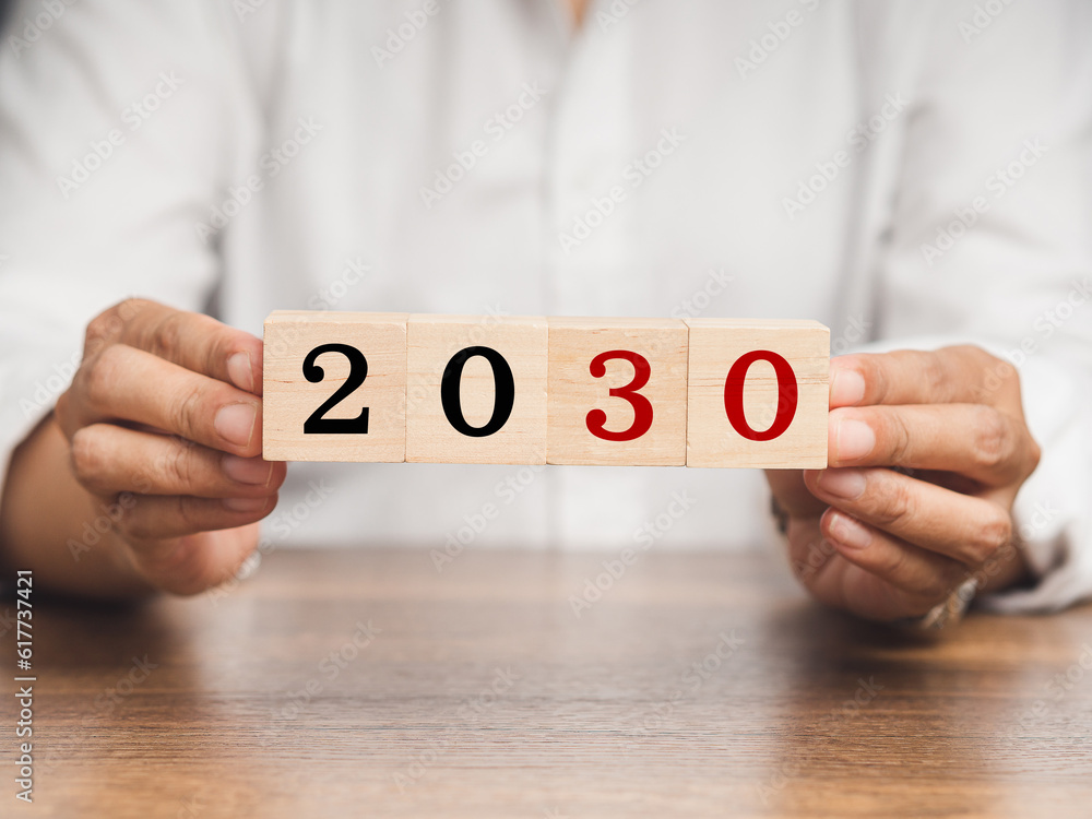 Countdown and Business Planning to 2030. Close-up of hand holding wooden cubes with the letters 2030 while sitting at the table.