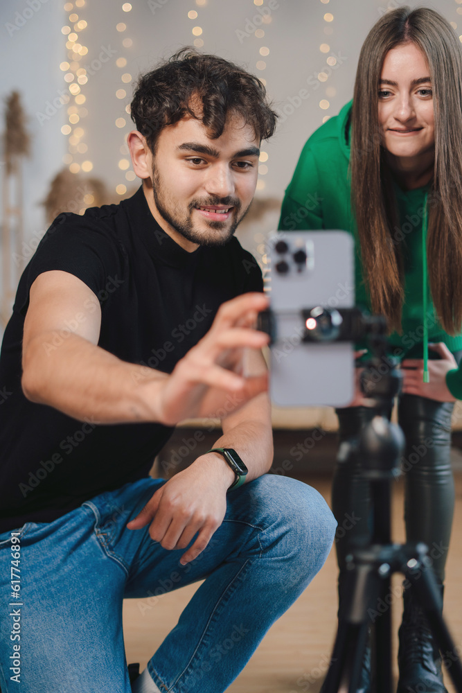 Cheerful young man and woman taking selfie on mobile phone while sitting at table in cozy room decorated for Christmas