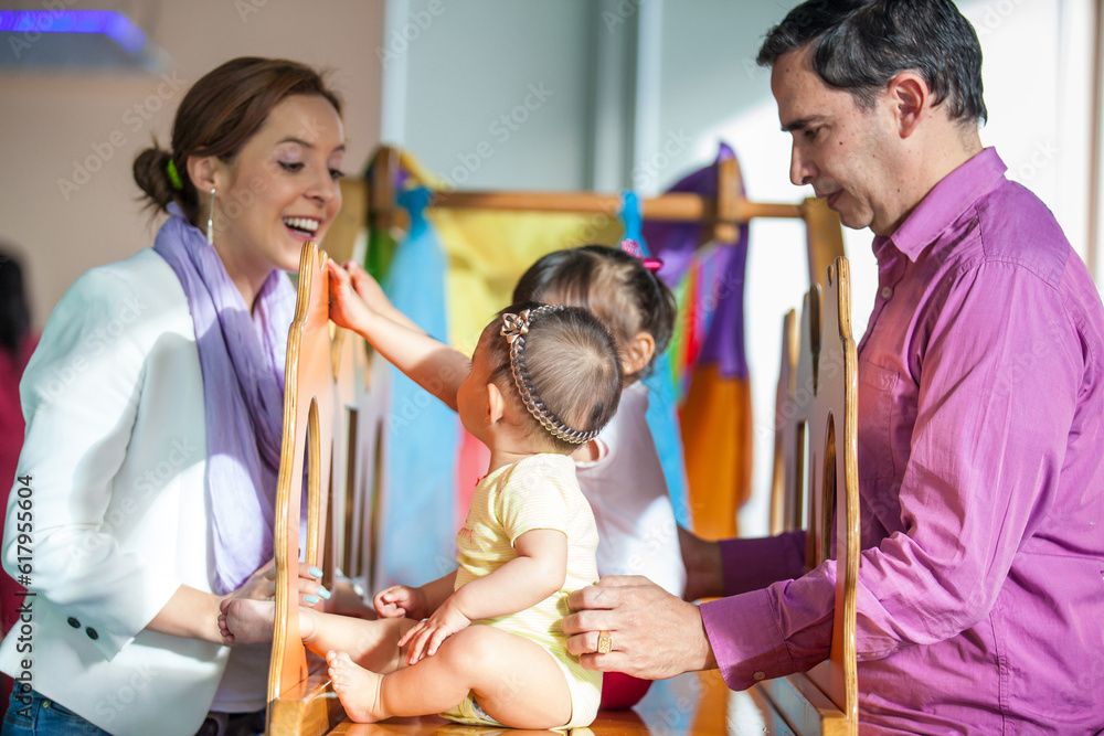 Beautiful ten months baby girl playing with her family. Early stimulation for toddlers concept.