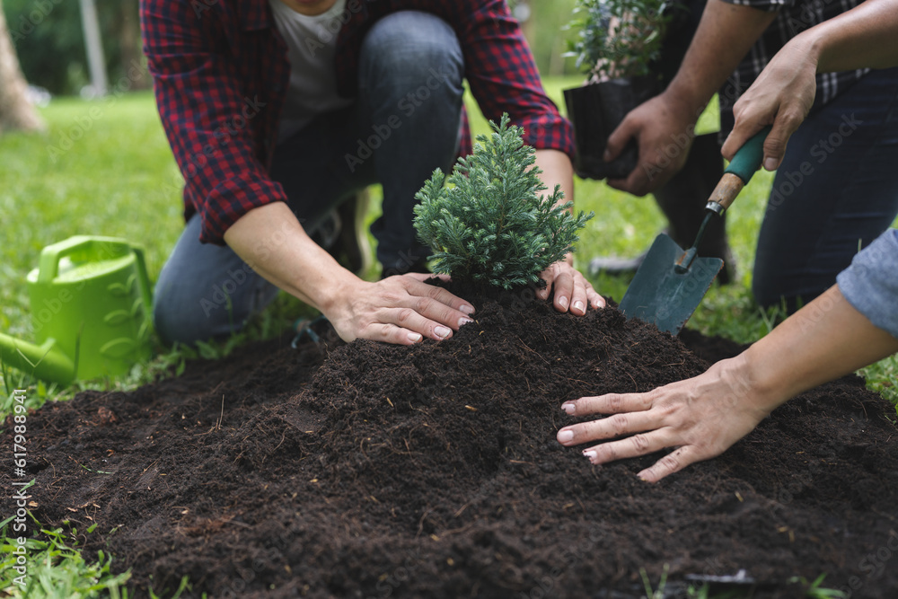 Volunteer team, youth helping to plant trees Shoveling to help increase oxygen in the air and reduce global warming Save world save life and Plant a tree concept.