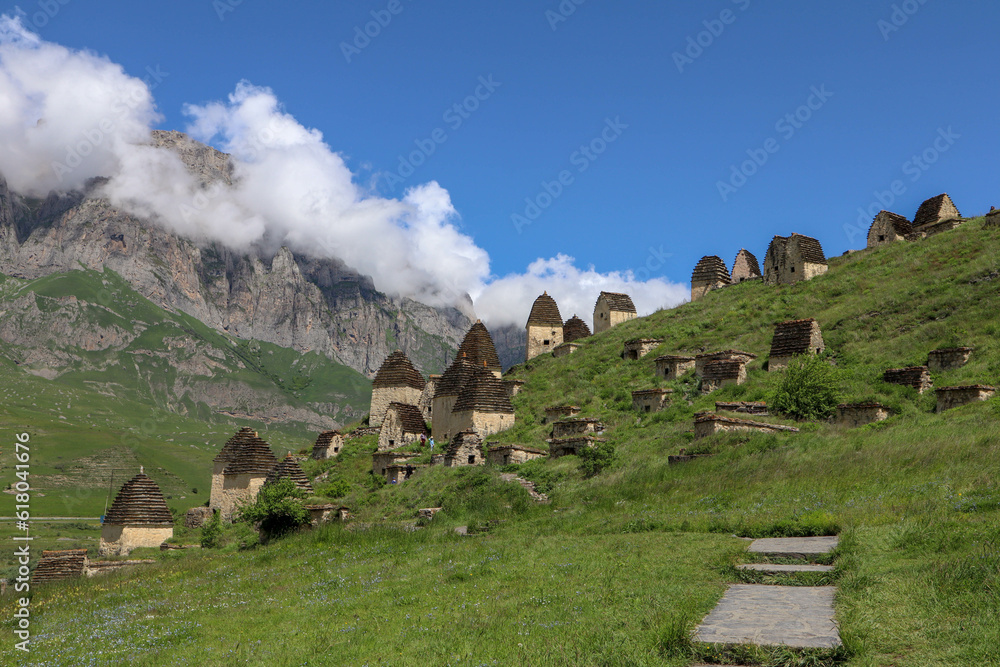 city of the dead Dargavs necropolis with landscape of the mountains with sky and clouds on the background