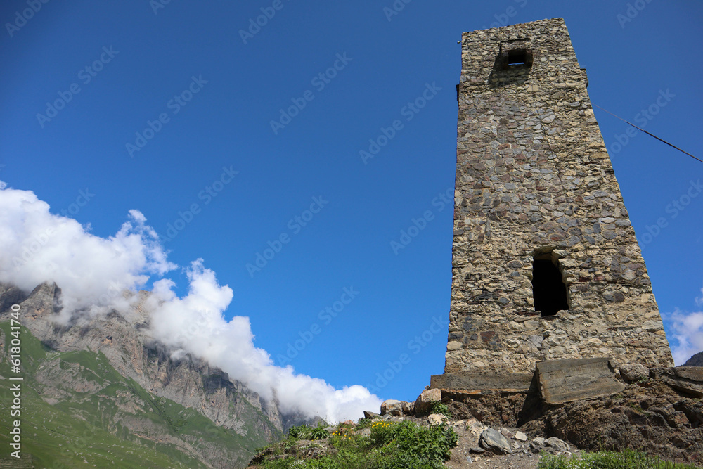 medieval stone battle tower in the city of the dead Dargavs necropolis with picturesque landscape on the background