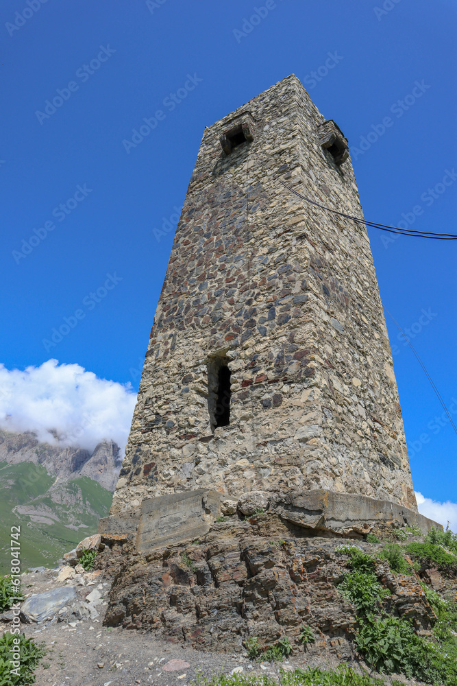 medieval stone battle tower in the city of the dead Dargavs necropolis with picturesque landscape on the background