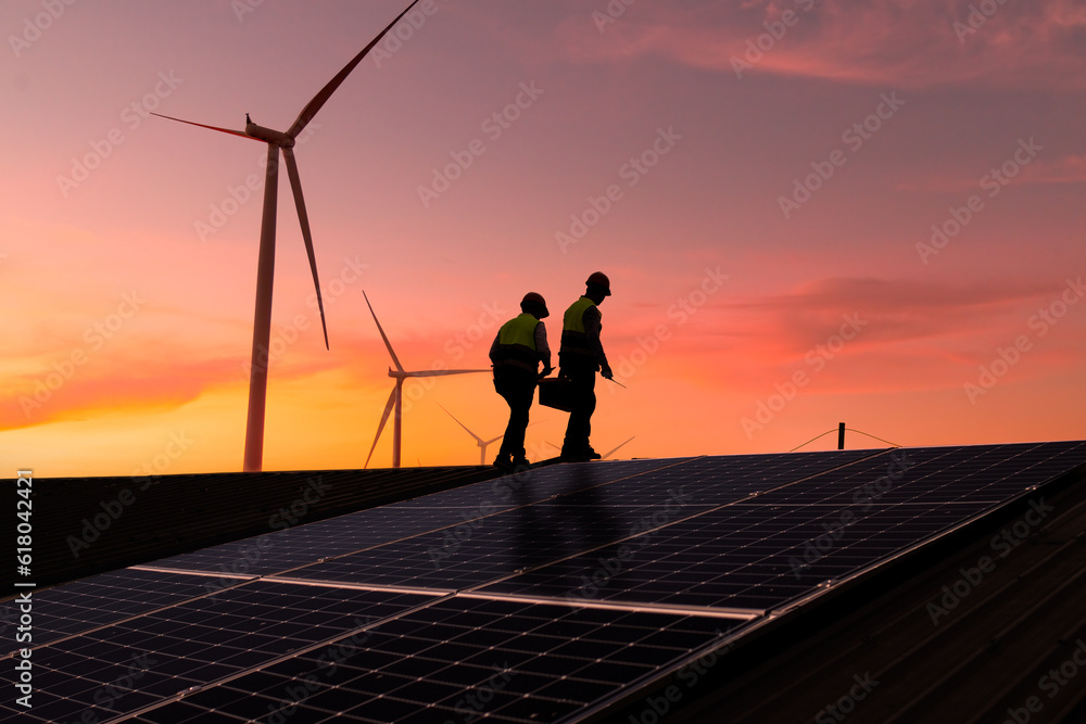 Silhouette engineer working on solar cell plant with windmill field .Solar cell smart grid and windmill are ecology energy renewable sunlight alternative green power environment factory