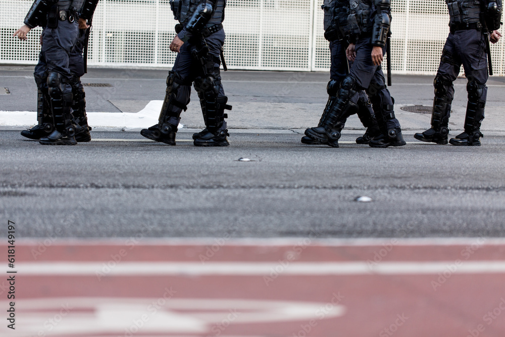 Pelotão de choque da policia. Na 27ª edição da Parada do Orgulho LGBT+ de São Paulo, Brasil.