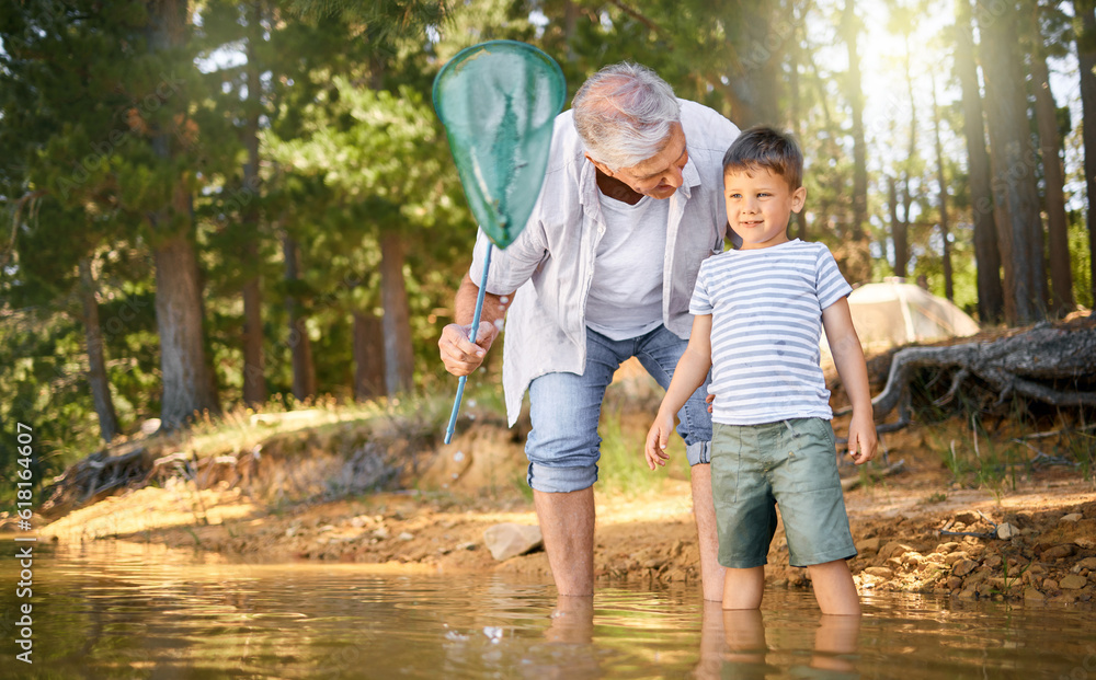 Camp, child with grandfather and with fishing net at the lake in the forest outdoor with a lens flare. Happy or freedom, adventure or nature and people bonding together for health wellness at river