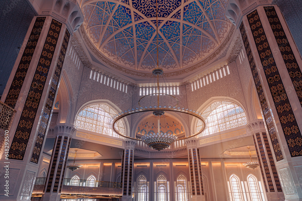 Sun light magic mosque Interior chandelier and ornamental details of Astana Nur-Sultan Kazakhstan