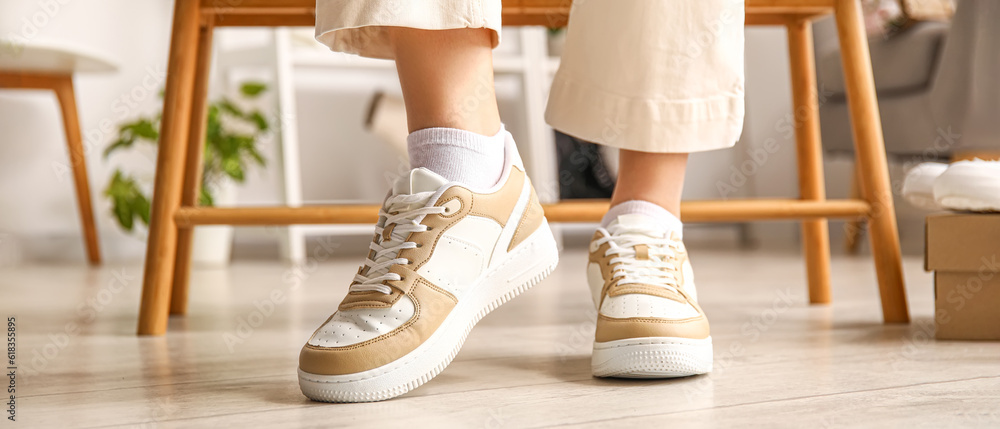 Woman trying on stylish sneakers in boutique