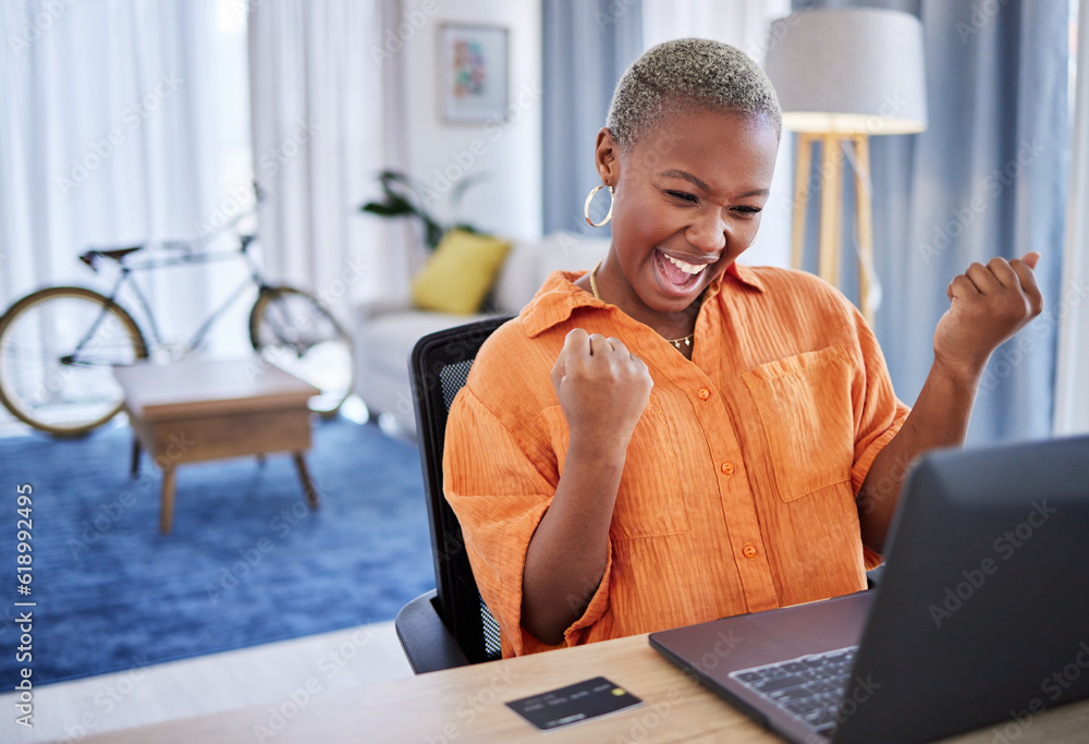 Credit card, laptop or excited black woman winning with success, goal or discount bonus online in home office. Happy trader trading or cheering for banking prize, goal target or good news in finance