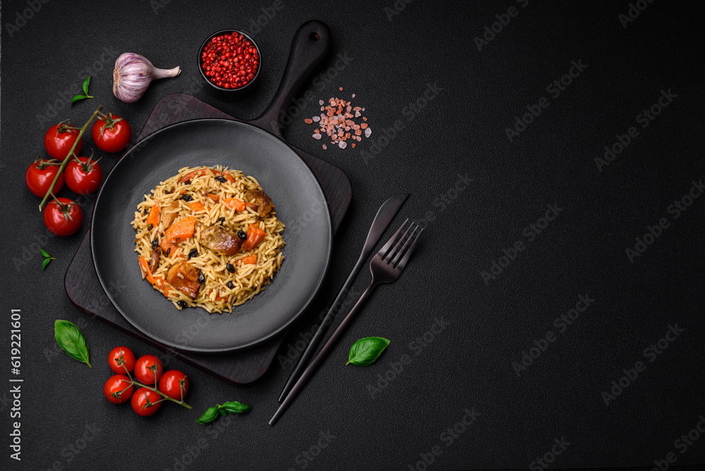Delicious fresh pilaf with rice, carrots, meat, onions, spices and berries