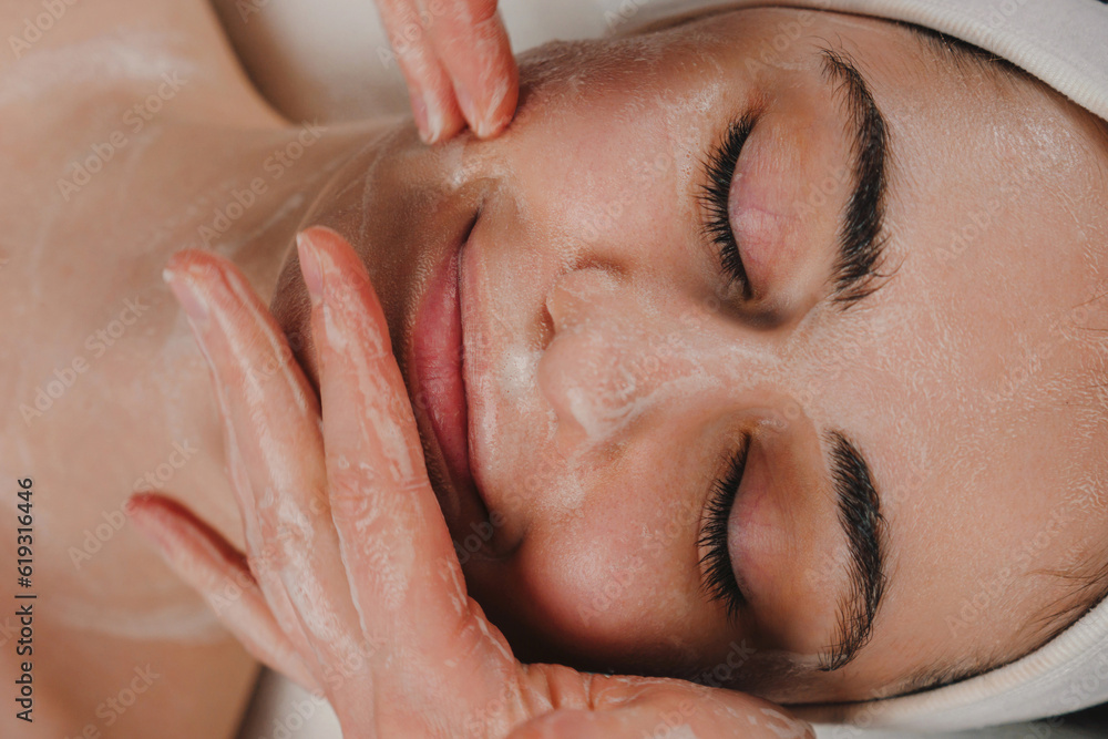 Crop anonymous female applying facial mask on face of young woman with closed eyes in a spa salon.