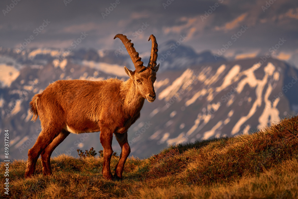 Suset, Ibex from Niederhorn, Switzerland. Ibex, Capra ibex, horned alpine animal with rocks in background, animal in the stone nature habitat, Alps. Evening orange sunset, wildlife nature.