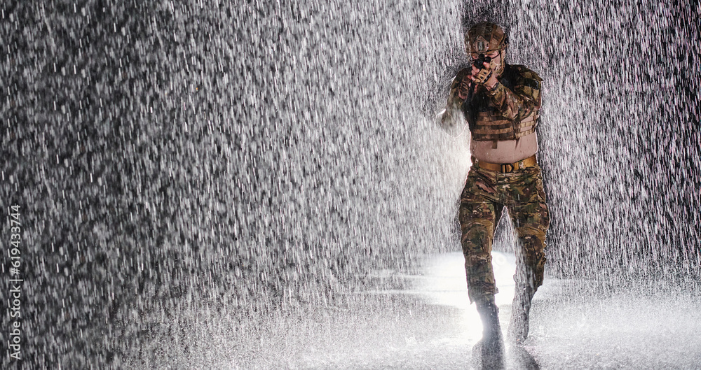Army soldier in Combat Uniforms with an assault rifle, plate carrier and combat helmet going on a dangerous mission on a rainy night.