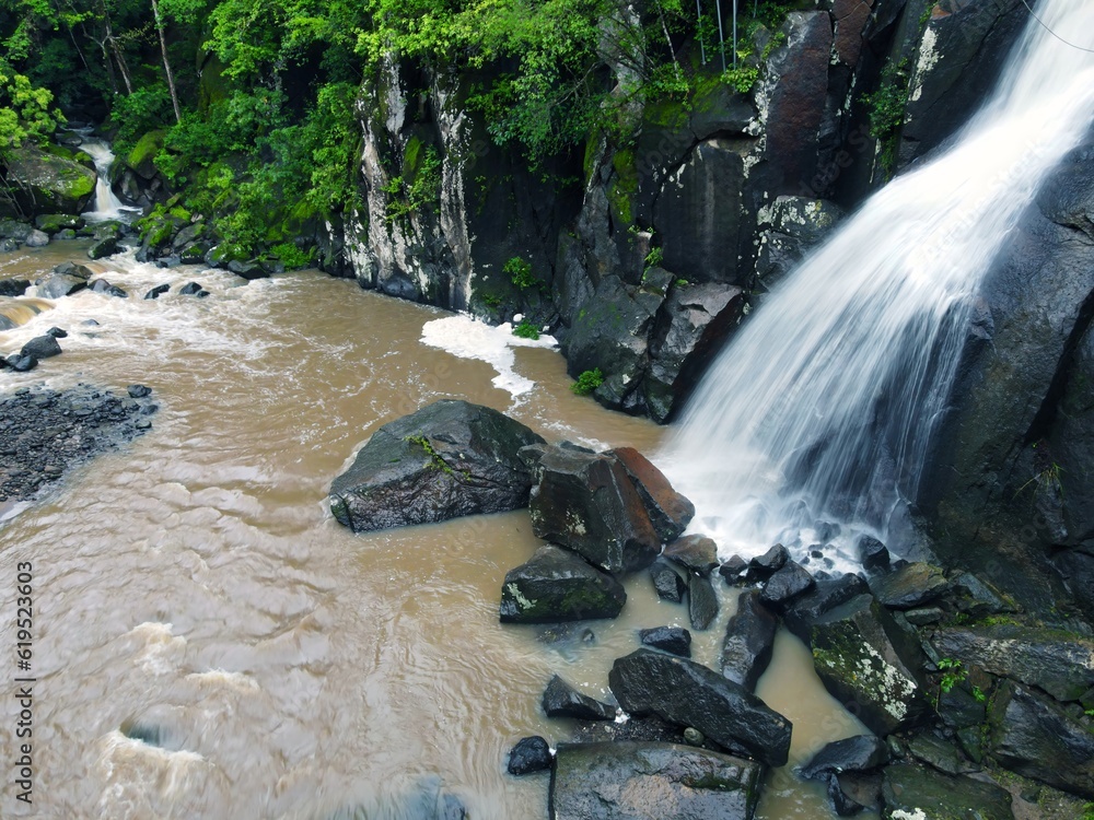 Waterfall crashing on rocks and a thermal river or creek in a tropical rainforest in Costa Rica